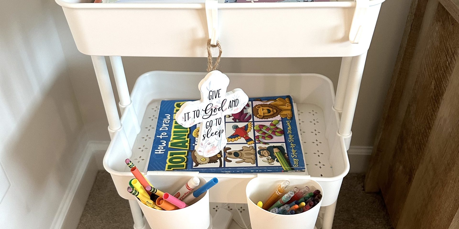 My daughter has always had a hard time falling asleep. She tends to lie there and thoughts begin to swirl through head making it even harder to fall asleep. We started allowing her to stay up and color or read if she’s wasn’t tired yet. This got messy real fast. Papers all over the place, markers and crayons everywhere. That’s when I found this cart from Amazon and filled it up.